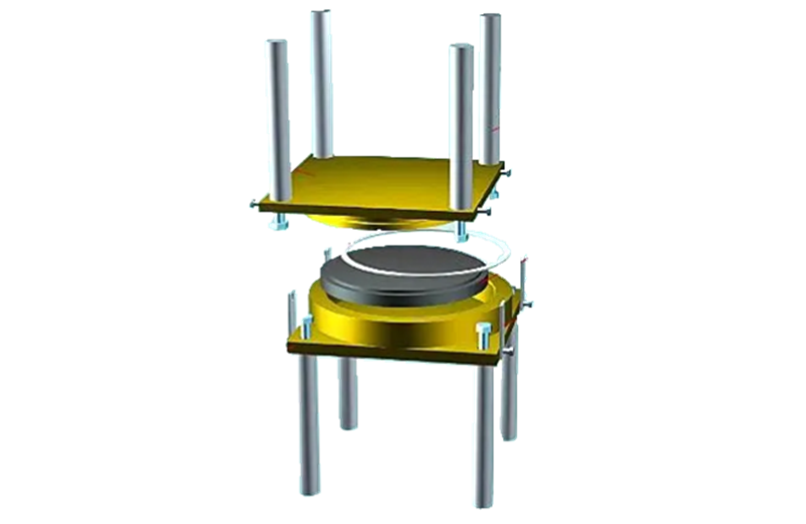 主要由顶板、不锈钢板、高性能滑板、中间钢板、橡胶板、钢盆、密封件及连接件组成。具有承载能力大,水平位移量大、转动灵活等优点。